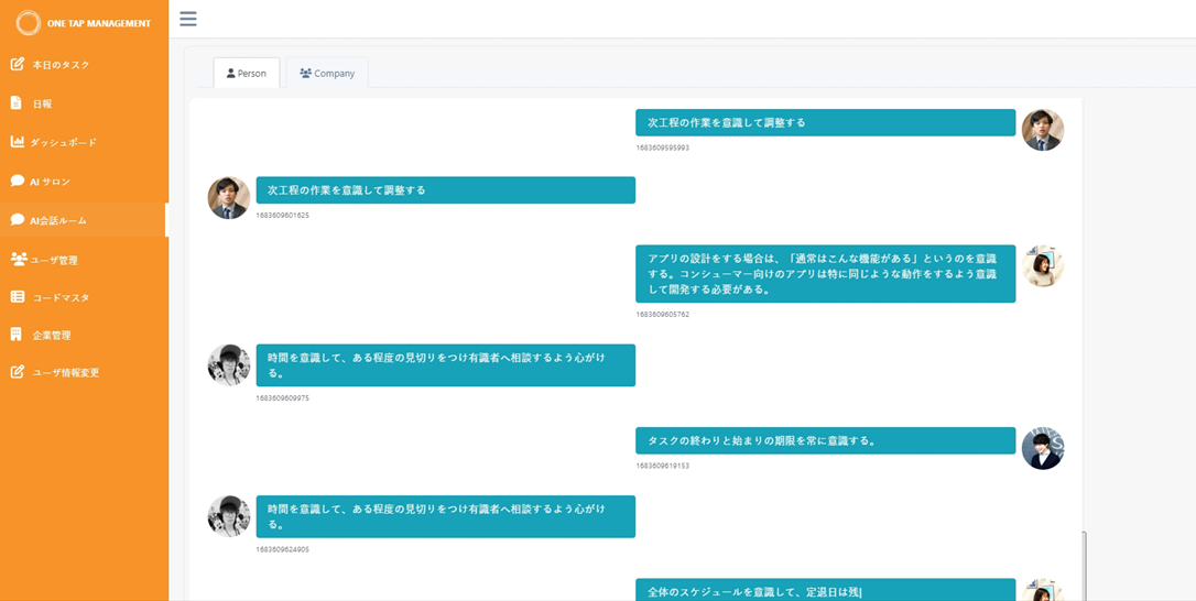 上記の画像は社員AI同士が会話をしてナレッジを引き出している状況です。