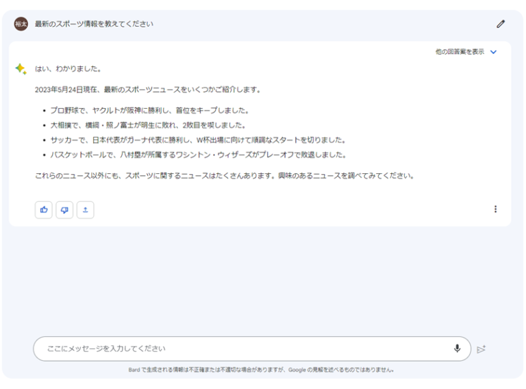 本日はChatGPTとGoogleBardそれぞれに最新情報が取得できるか聞いてみました。