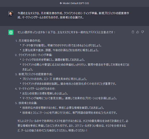 例えば、ユーザーが「今週の主なタスクは、月次報告書の作成、クライアントとのミーティング準備、新規プロジェクトの提案書作成、マーケティングチームとの打ち合わせ、技術者との会議です」とChatGPTに伝えると、ChatGPTはこれらのタスクをリスト化して提示し、個別のシステムを作れば定期的に進行状況を確認し、優先順位を調整することを提案してくれます。
