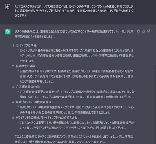 また、さまざまなタスクの優先順位を評価し、どのタスクから始めるべきかを提案することも可能です。