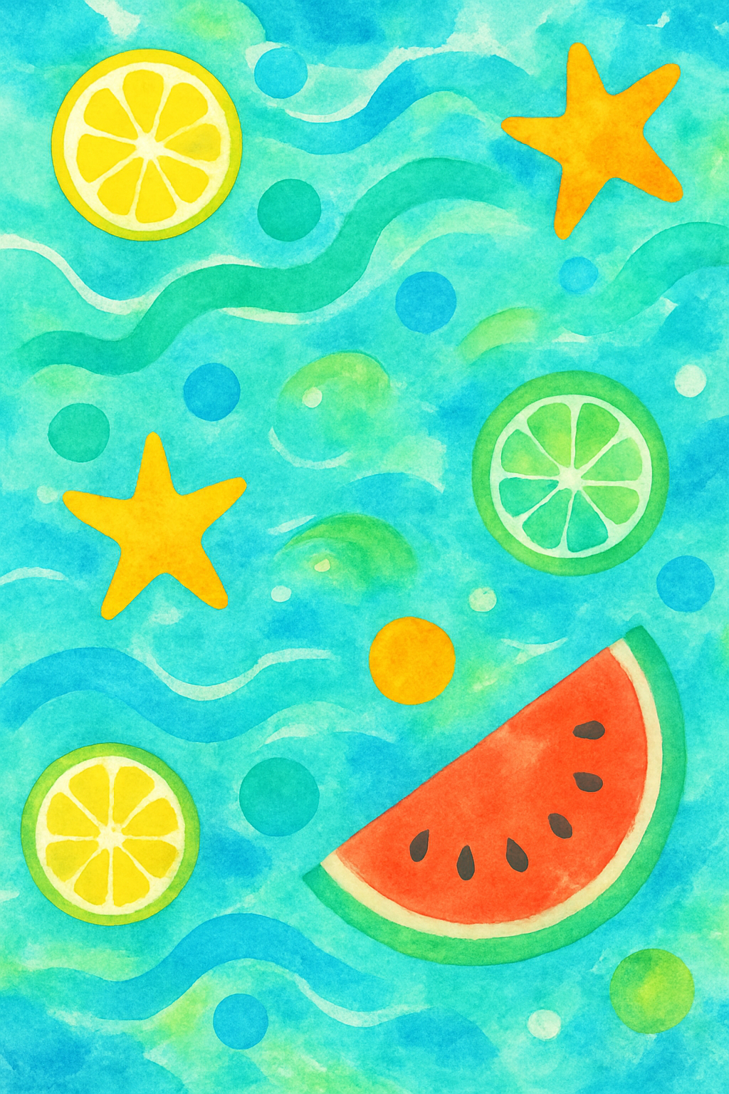 水面のゆらぎや光の反射を連想させる絵の具のタッチを活かし、透明感のあるブルーやエメラルドグリーンを中心に、夏らしい色彩で構成してください。