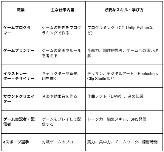 ここからは、「ゲームが好き」を活かせる仕事の例です: