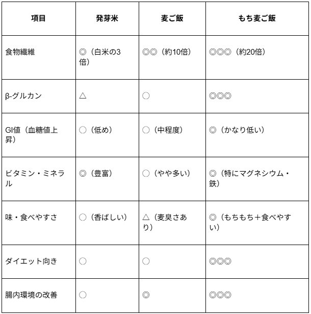 発芽米、麦ご飯、もち麦ご飯の3つを栄養価や健康効果の観点から比較し、それぞれの特徴とメリットを説明してください。