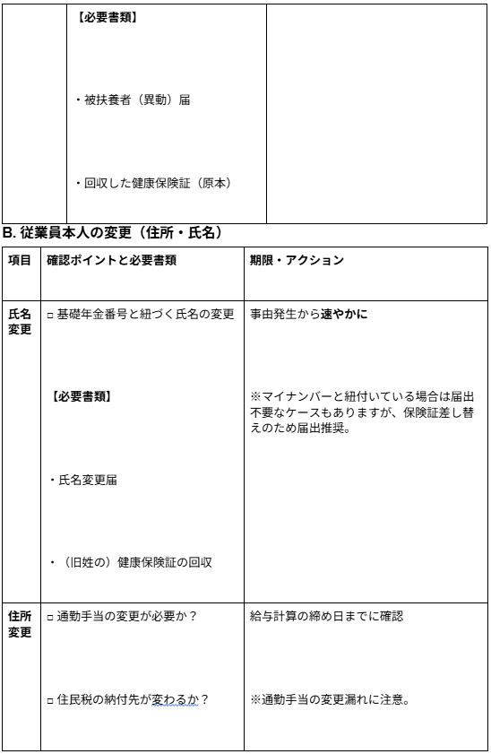 ご要望いただきました「従業員向け 事前質問票」および「社会保険変更チェックリスト」を作成しました。