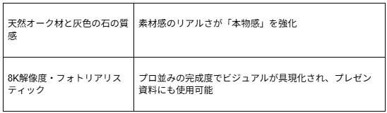 この一文をGeminiに入力するだけで、まるで高級建築雑誌の表紙のような1枚が生成されます。