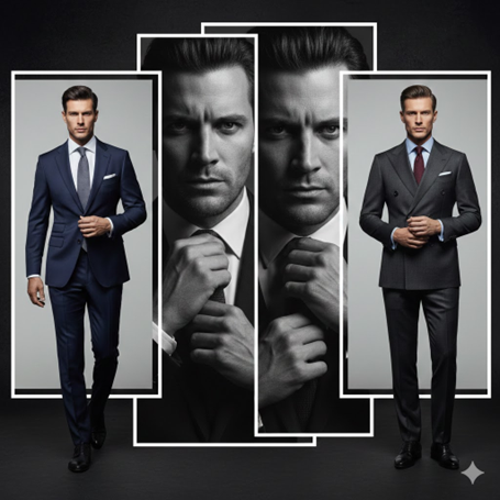 Right panel: Full-body shot of a third man in a charcoal grey double-breasted suit posing confidently.